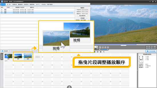 通过软件的超级剪刀功能,可以将视频分割开,将多余的镜头删除掉,将视频片段拖放至合适位置并调整顺序。具体的操作如下:点击进度条中间向下凸起的箭头,或者通过快捷键Ctrl+E,软件会自动打开创新式时间轴,移动滑块到剪辑点,点击底部超级剪刀(Ctrl+Q),将视频分割开。依次分割,将不需要的片段,点击缩略图右上角的“X”按钮删除掉。拖曳视频缩略图,根据主题,重新调整片段的顺序。