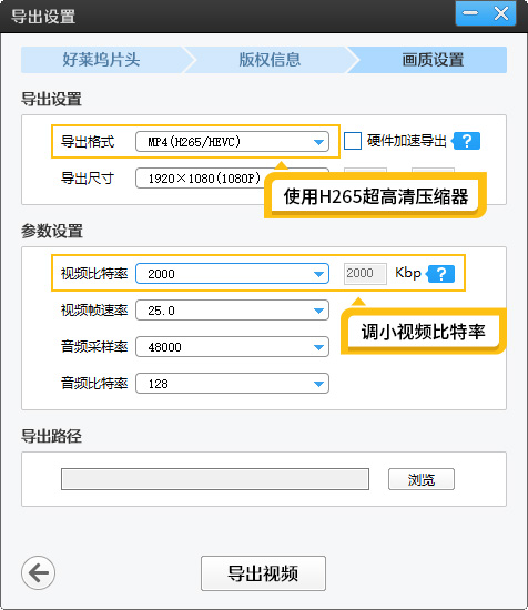 在导出视频时,从“视频格式”的下拉菜单里选择“MP4(H265/HEVC)”格式,同时调低“视频比特率”,最后点击“导出视频”按钮。