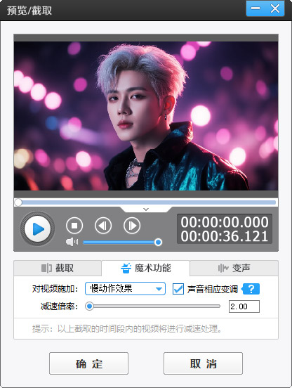 适当对爱豆的舞蹈动作进行慢放处理,能让画面更具感染力。如果你想让视频中的某个精彩片段以慢动作呈现,让观众更清晰地捕捉细节,操作也很简单。用鼠标右键单击需要处理的视频片段,在弹出的菜单中选择“魔术功能(变速/定格)”,随后会弹出一个功能设置窗口,在里面找到“慢动作效果”并启用,接着按照你预期的慢放程度,灵活调整减速速率,这样就能让视频片段实现丝滑的慢放效果。